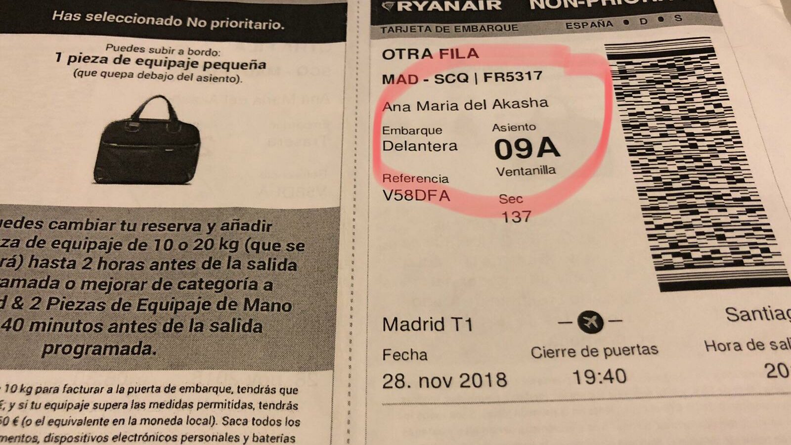 Viajaba en avión, con Ryanair, de Santiago a Madrid. Había comprado un ida y vuelta para el día. Al imprimir la tarjeta de embarque, el día antes, me di cuenta de que mis apellidos no figuraban en la tarjeta de embarque y quizá no pudiera acceder al avión. 😱😱
